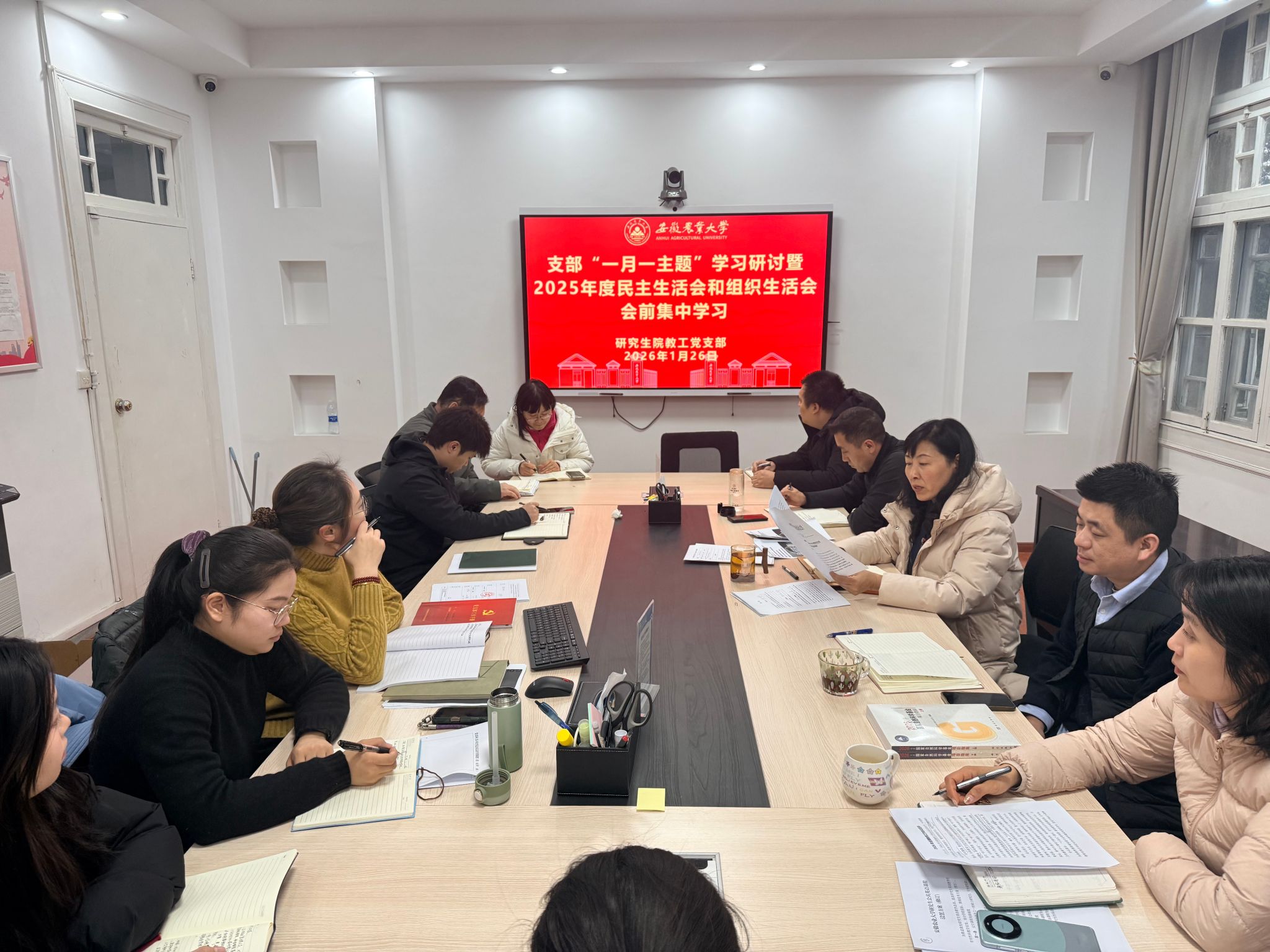 本网讯 1月26日下午,研究生院教工党支部召开“一月一主题”学习研讨暨2025年度民主生活会和组织生活会会前集中学习。会议由党支部书记唐红萍主持,支部全体党员参加学习。
