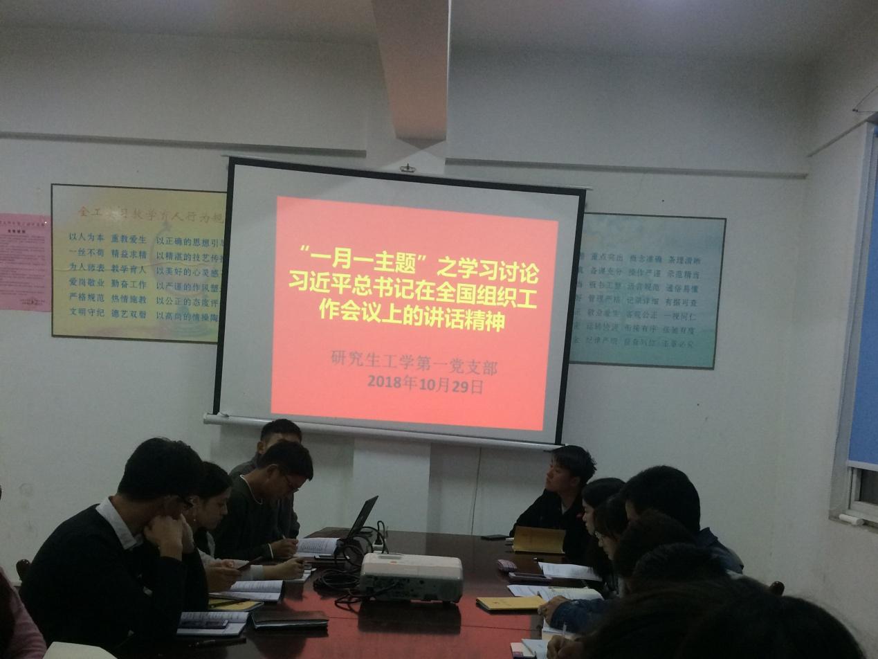 2018年10月29日晚上,研究生工学第一党支部在机电工程园召开以学习习近平总书记在全国组织工作会议上的讲话精神为主题的会议,研究生工学第一党支部的全体成员参加了本次会议。