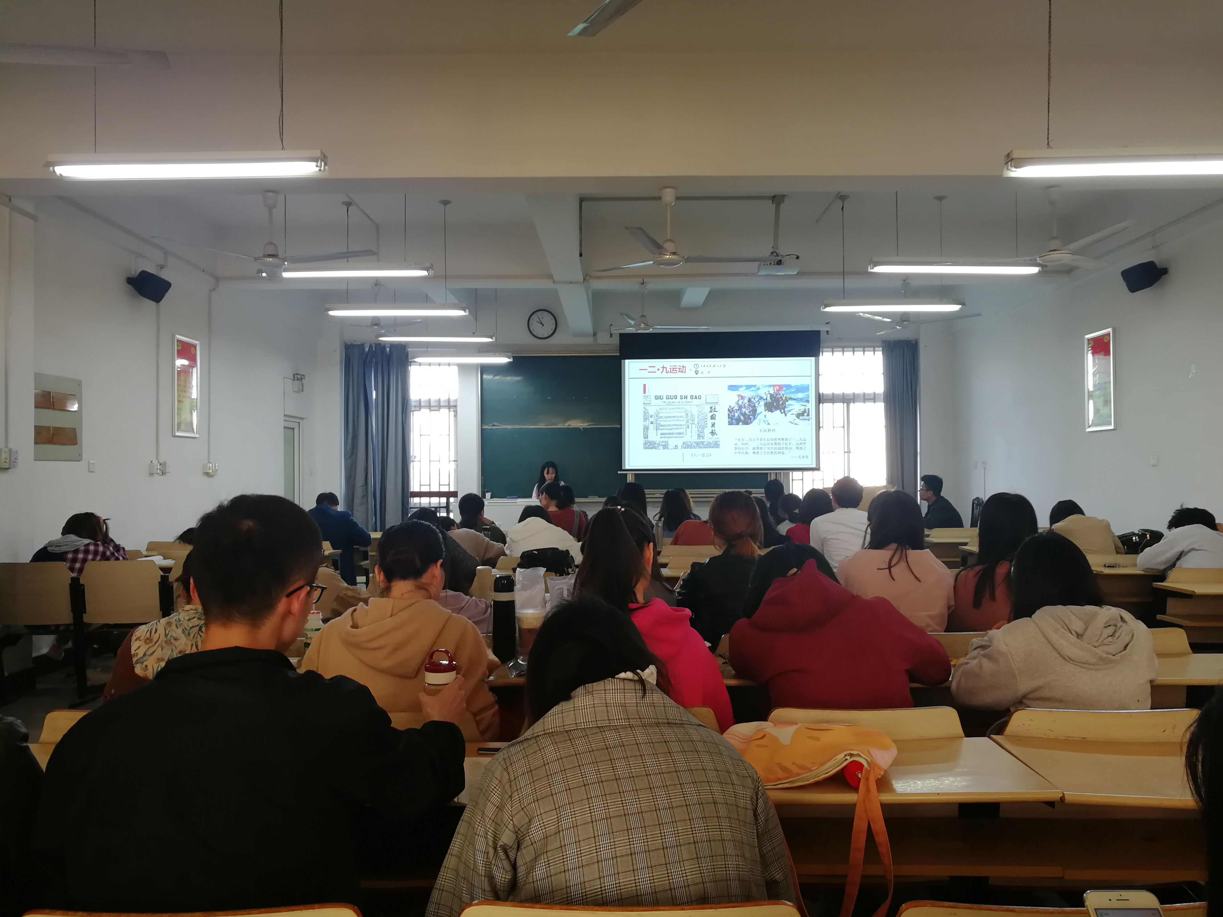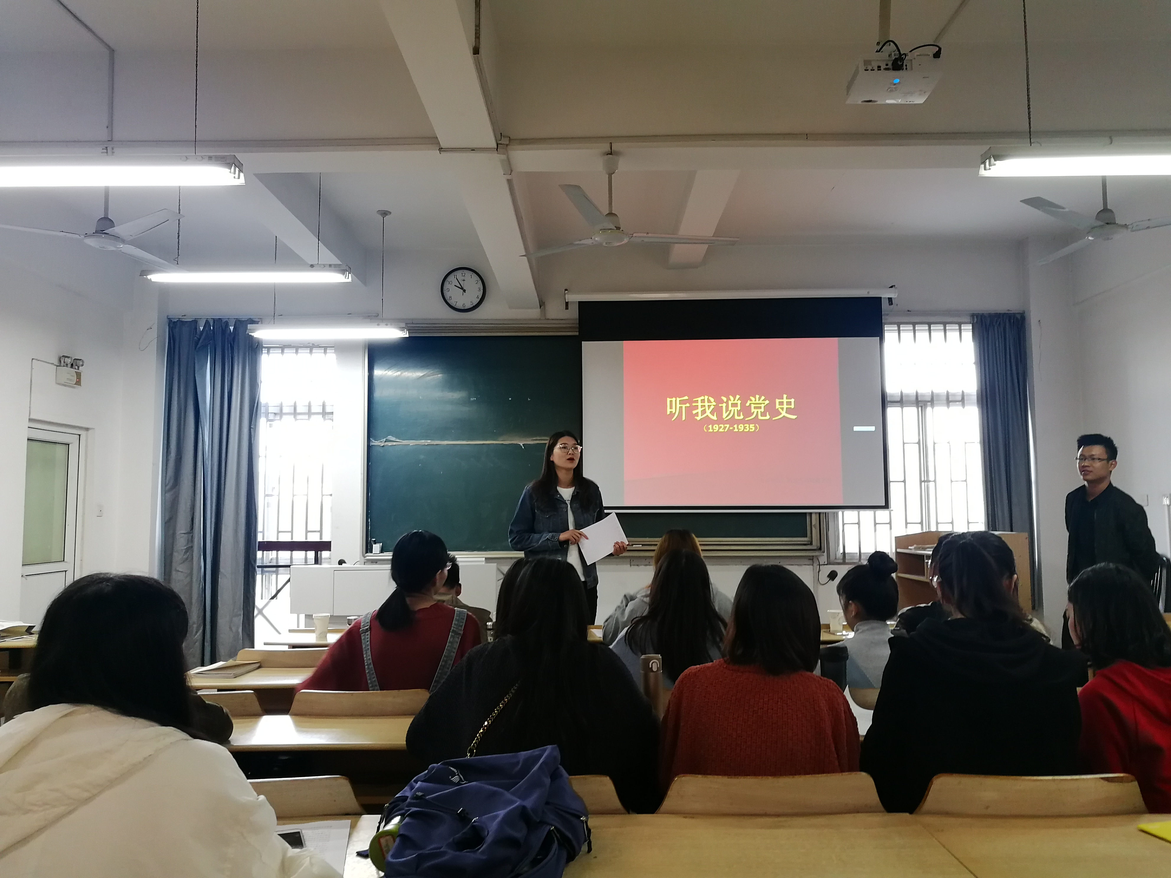首先,播放《画说党史》短片。随后,进行主题宣讲,分别是《枪杆子里出政权 》;《古田丰碑,奠定军魂》;《军民齐心,共创辉煌——第一次反围剿胜利》;《长征精神》;《遵义会议,革命定向》;《齐心一二九,不当亡国奴》。以实事求是的精神,客观的解读了我党的历史事实以及无私奉献,不怕流血,不怕牺牲的英勇无畏的革命精神,对新时代青年坚定理想信念,构建主流意识形态的具有重要的现实意义。