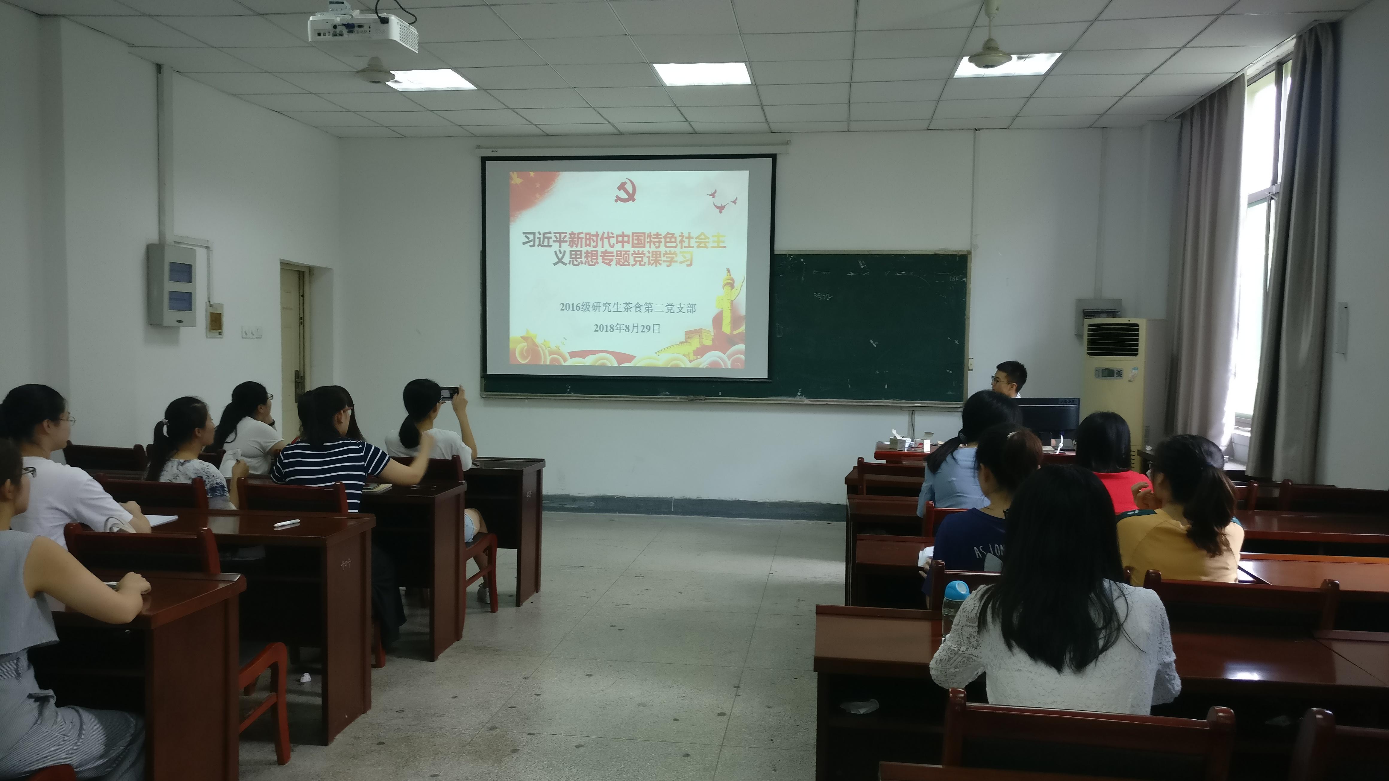 为深入学习贯彻习近平新时代中国特色社会主义思想和党的十九大精神,2016级研究生茶食第二党支部于8月29日在茶业楼404开展了“开学第一课——学习党的十九大精神”专题党课。