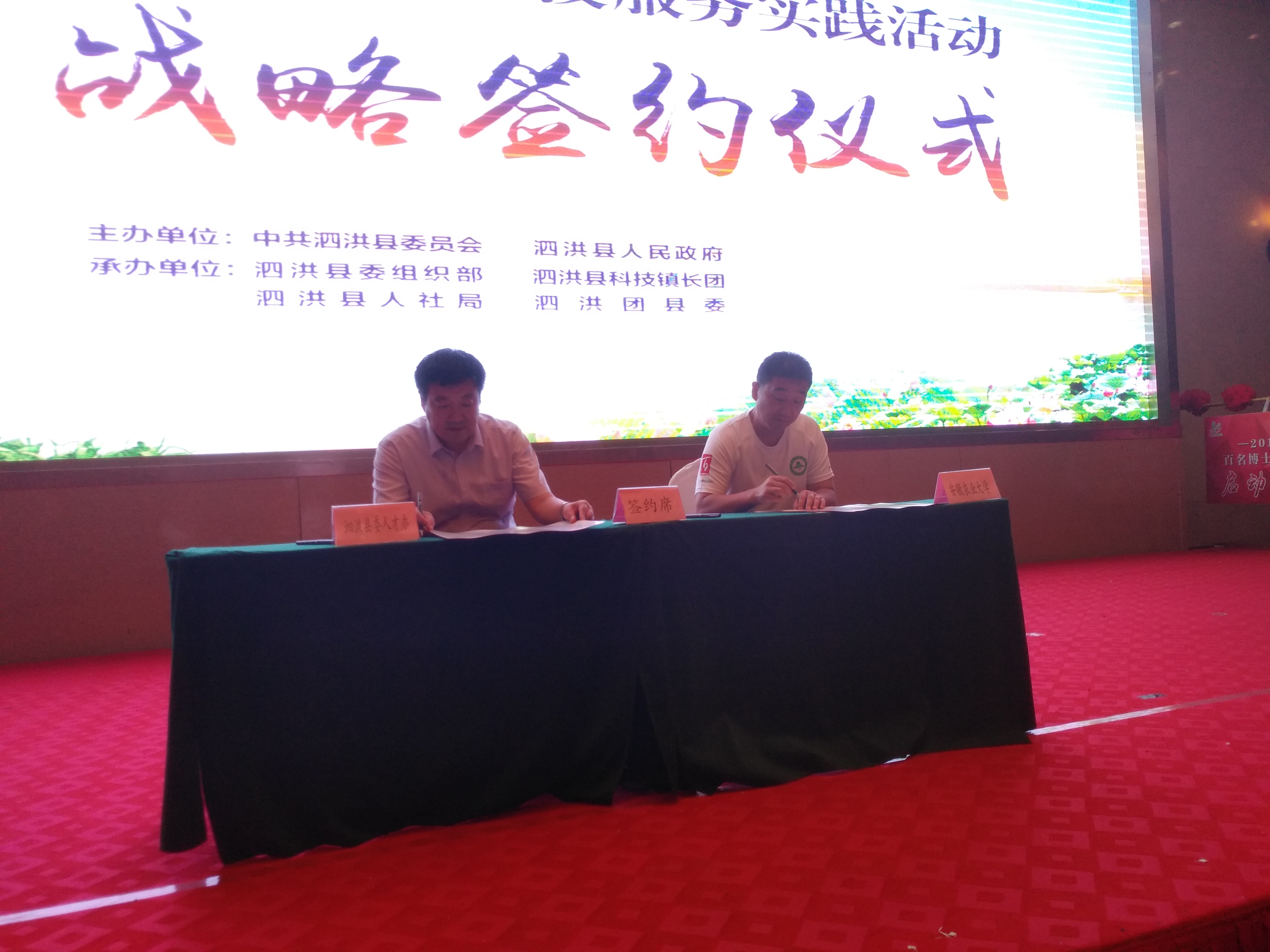 启动仪式上,姜家生代表我校与泗洪县委人才办主任杨卫华签署了人才战略合作协议,并共同为安徽农业大学(泗洪)博士生实践基地揭牌,泗洪县常务副县长范德珩为全体高校博士团授旗。