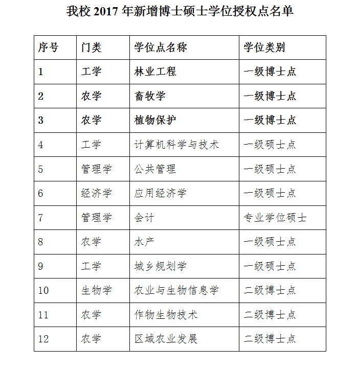 本网讯:日前,教育部公示了2017年学位授权审核结果,我校林业工程等3个一级博士点、计算机科学与技术等5个一级硕士点和1个会计专业学位硕士点审核通过,同时,作物生物技术、区域农业发展和农业与生物信息学3个二级博士学位点也备案成功,我校学位点建设取得了新突破。目前我校现有博士一级学位点8个,硕士一级学位点18个,专业学位7类。