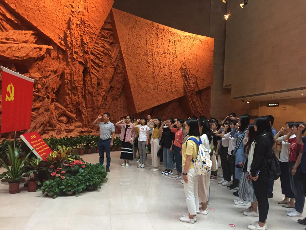 为庆祝伟大祖国成立七十周年,2019年9月29日,人文社会科学学院党支部与研究生马院第一党支部共赴渡江战役纪念馆开展“不忘初心、牢记使命”主题教育党日活动,师生党员在人文社会科学学院党委副书记、副院长吕大鹏带领下,面对党旗进行入党宣誓,重温入党誓词。