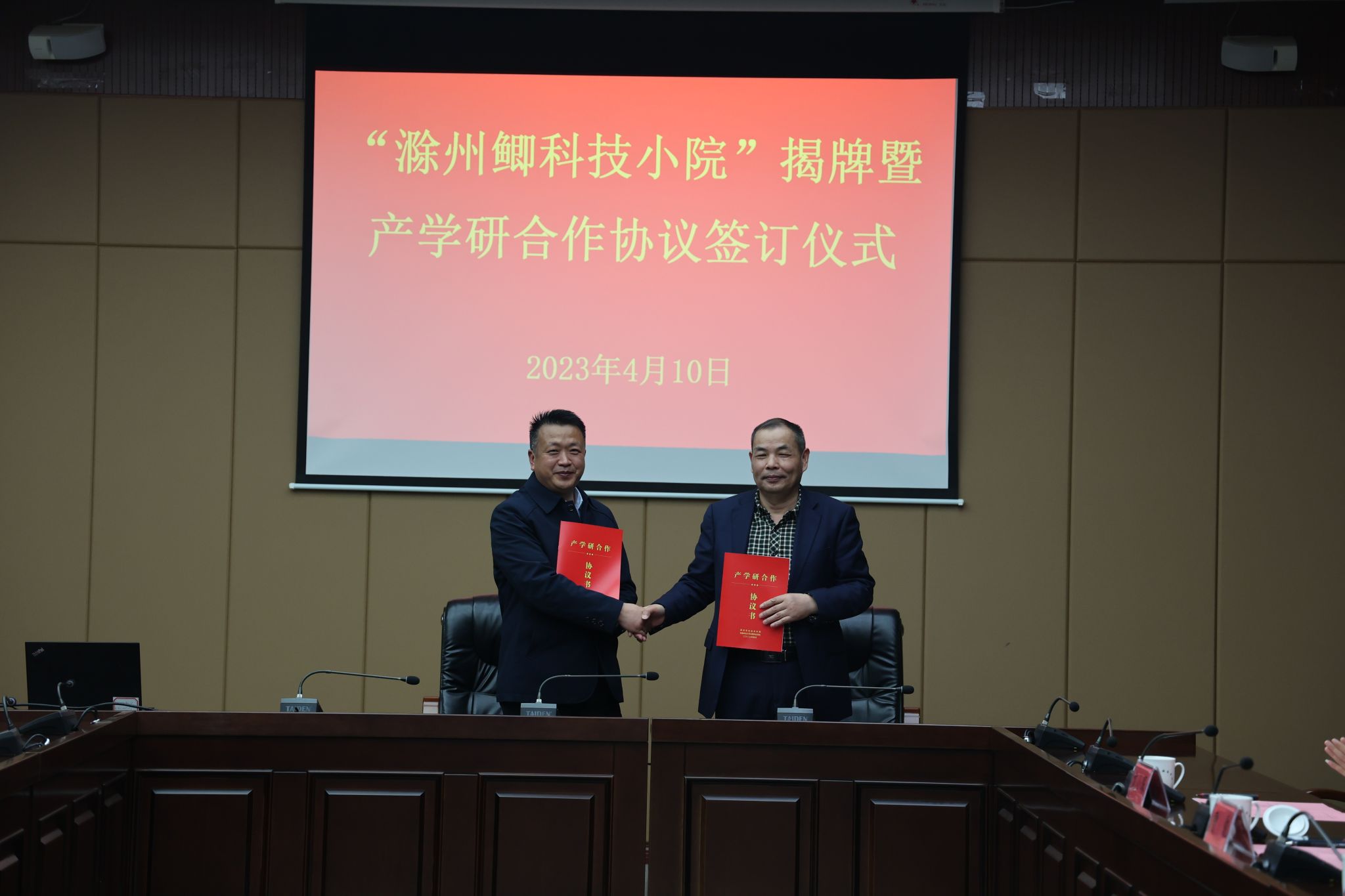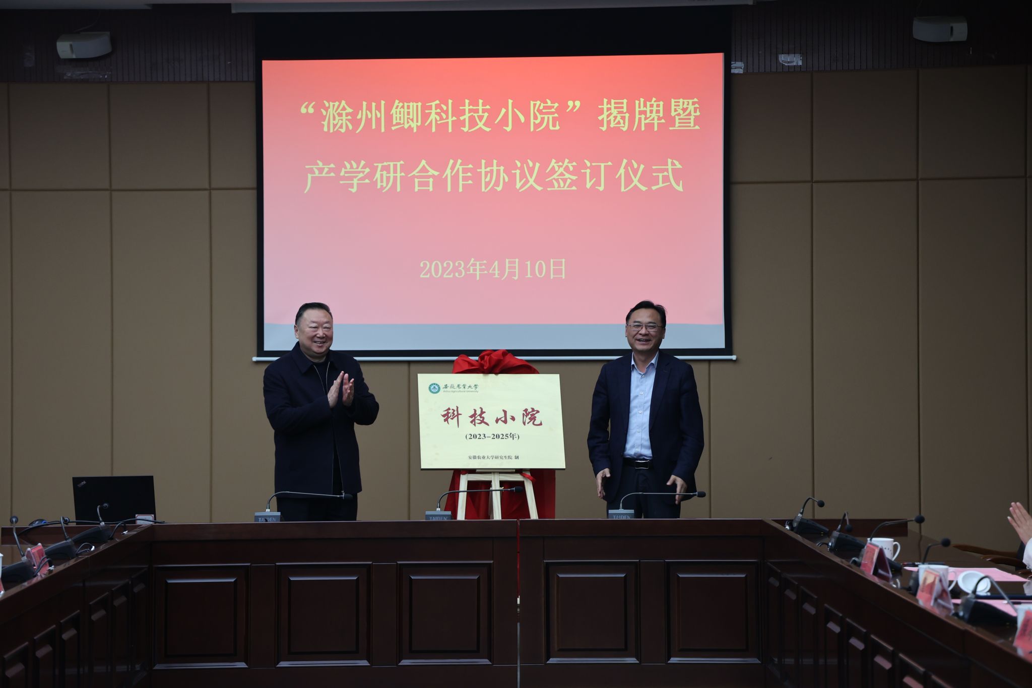 会上,动物科技学院还与滁州市农业农村局签订了“滁州鲫种质资源保护与开发利用”产学研合作协议。