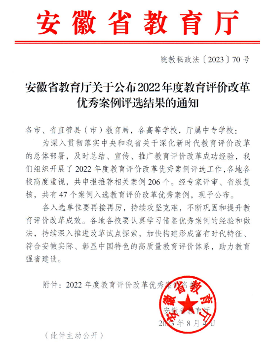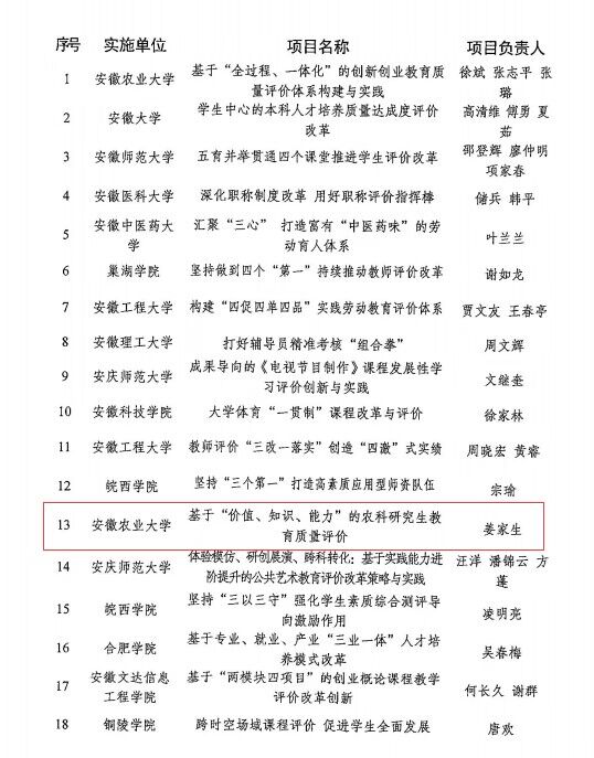 本网讯:近日,安徽省教育厅公布了2022年度教育评价改革优秀案例,我校《基于“价值、知识、能力”的农科研究生教育质量评价》获得高等教育评价改革优秀案例。