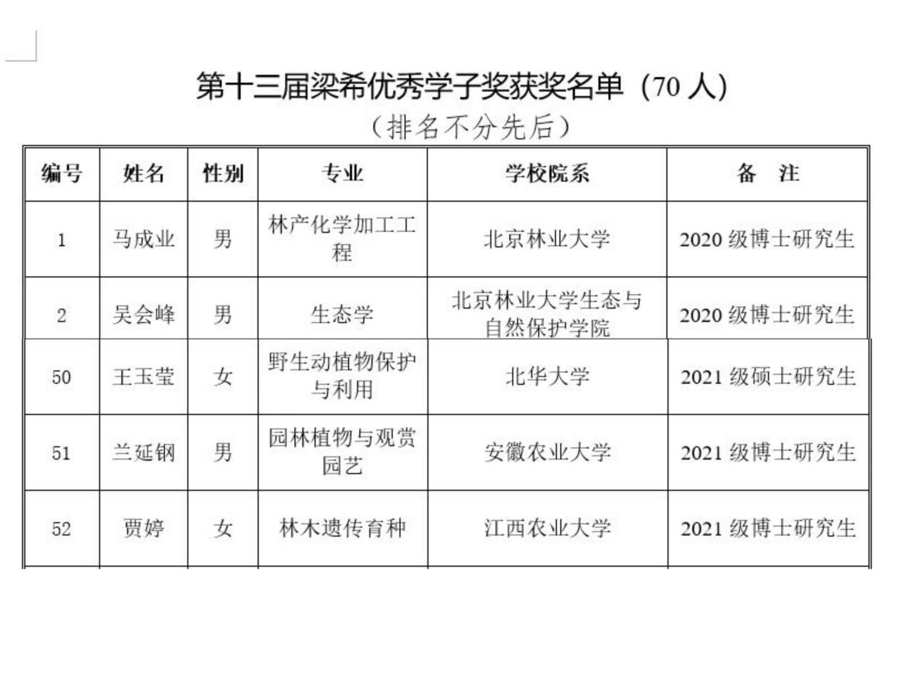 “梁希优秀学子奖”由中国林学会设立,旨在纪念著名林学家和林业教育家梁希先生,激励林业专业学生牢固树立“献身、创新、求实、协作”的科学精神,培养和造就一批品学兼优、全面发展的林业和草原科技后备人才,促进林业高校学生的全面发展,激发人才活力,推动林业和草原事业高质量发展。“梁希优秀学子奖”的奖励对象为全国林业高等院校和设有林学院的农大、综合性大学林业及相关专业的本科生、在读硕士生和博士生。