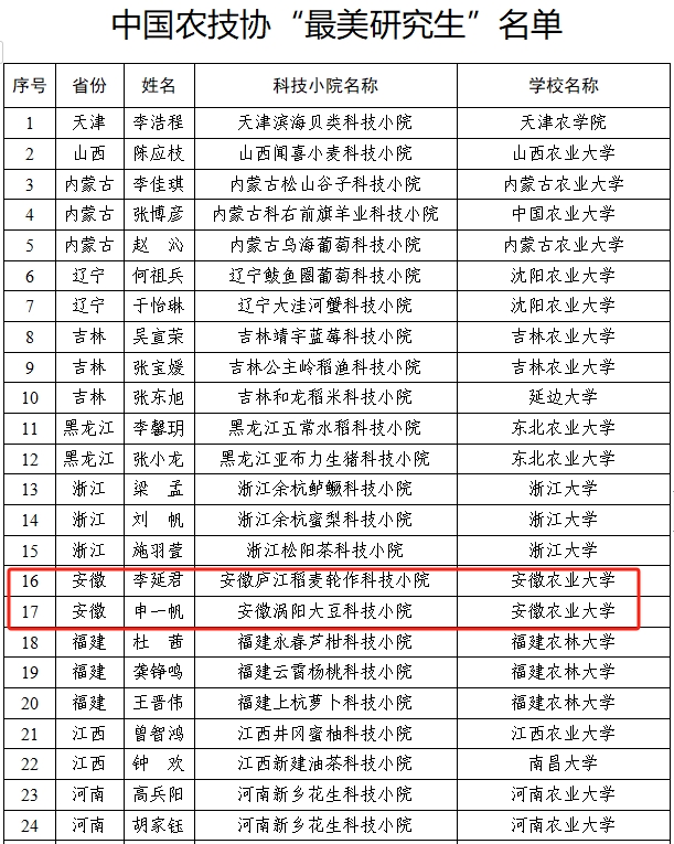 本网讯:4月12日,中国农技协“最美科技小院”“最美研究生”评选落下帷幕。我校安徽岳西茶叶科技小院、安徽庐江稻麦轮作科技小院荣获中国农技协“最美科技小院”称号,科技小院学生李延君、申一帆荣获“最美研究生”称号。我校为安徽省唯一获评高校。