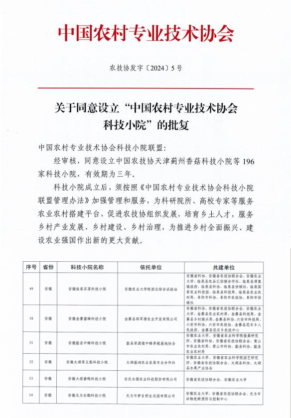 近日,中国农技协下发了《关于同意设立“中国农村专业技术协会科技小院”的批复》,我校安徽临泉芥菜科技小院、安徽金寨蜜蜂科技小院、安徽歙县中蜂科技小院、安徽太湖翠玉梨科技小院、安徽大观番鸭科技小院、安徽无为白鹅科技小院等6个科技小院获立项支持。