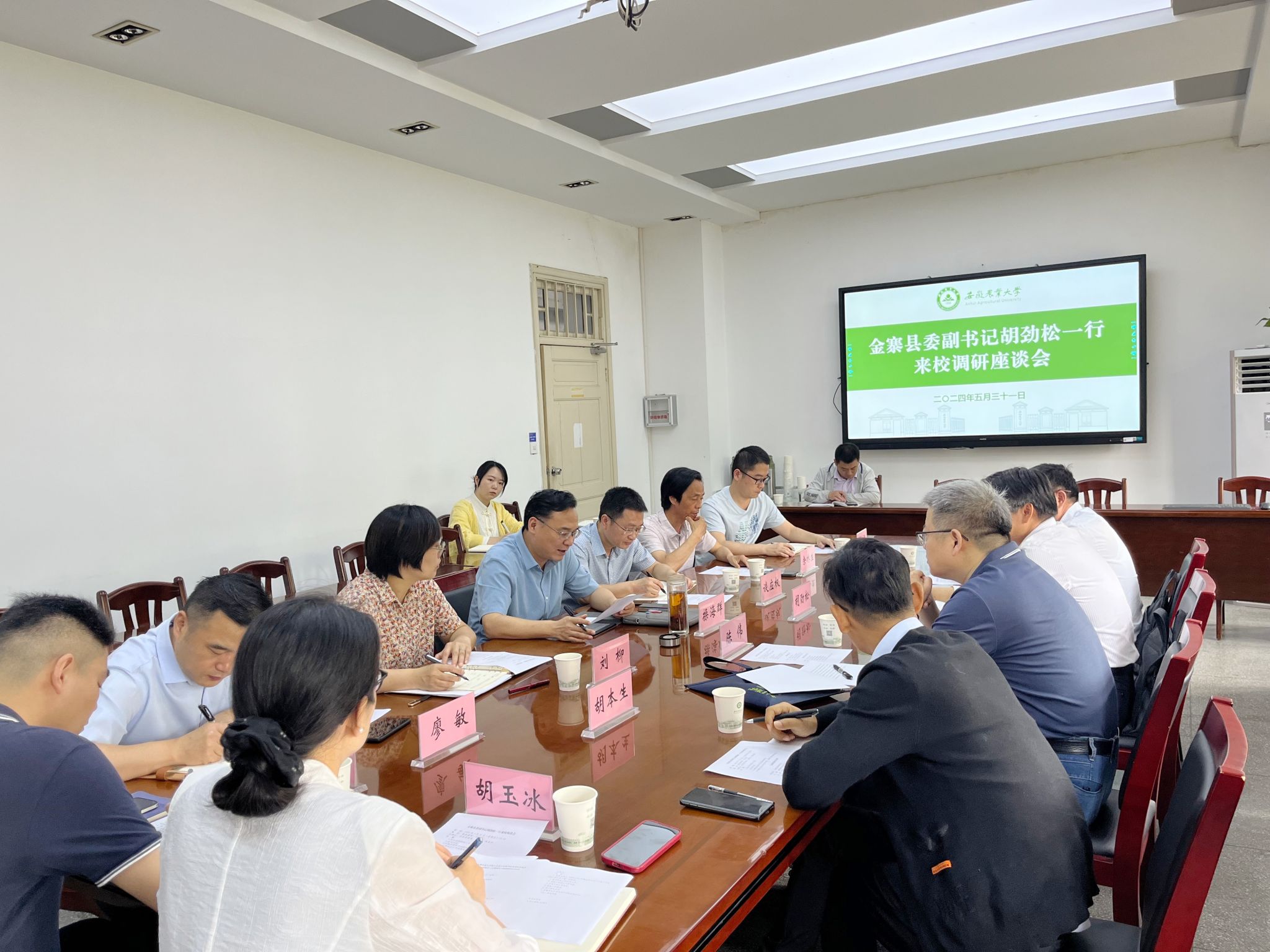 5月31日上午,金寨县委副书记胡劲松一行来校调研,双方就深化校县合作、金寨蜜蜂产业发展和科技小院工作开展座谈交流。校党委党委、副校长操海群主持会议。
