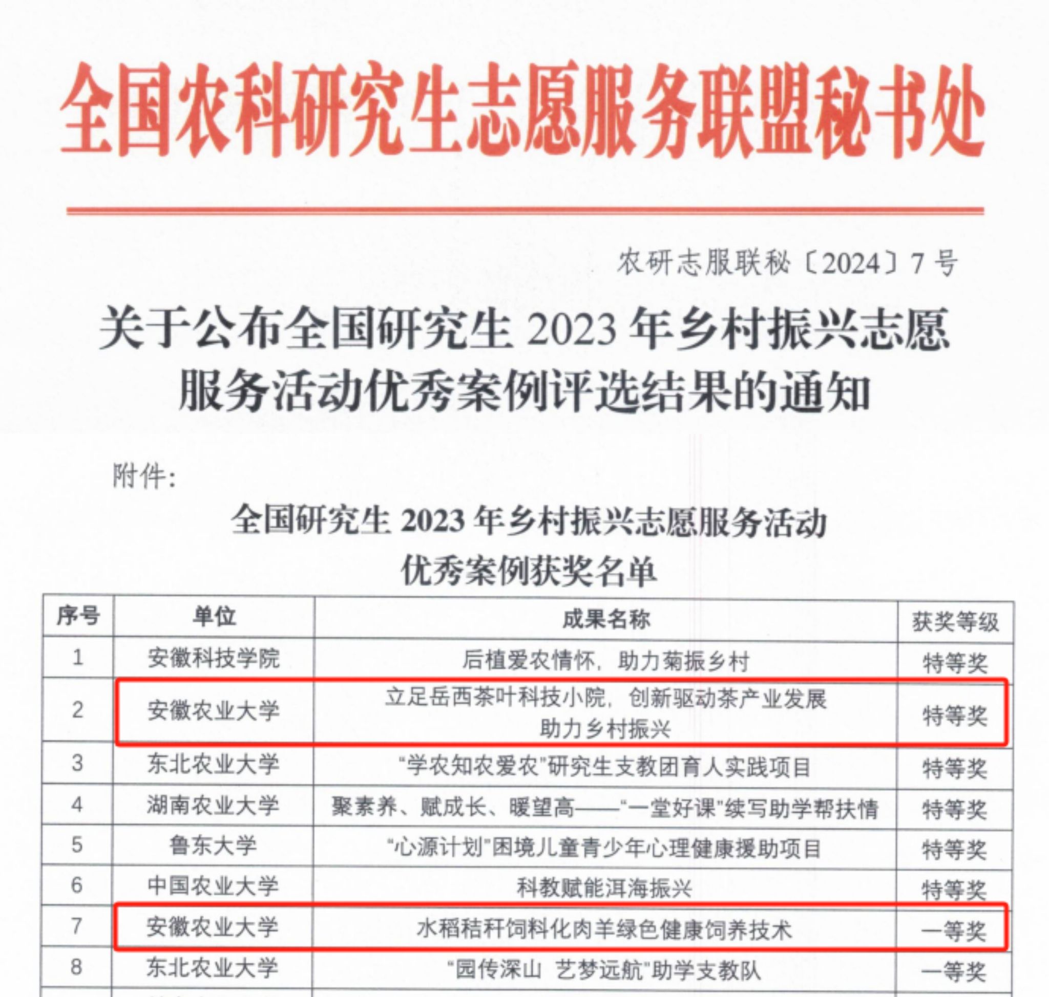 本网讯:近日,全国农科研究生志愿服务联盟秘书处下发了《关于公布全国研究生2023年乡村振兴志愿服务活动优秀案例评选结果的通知》,我校推荐的案例获得特等奖1项,一等奖1项。