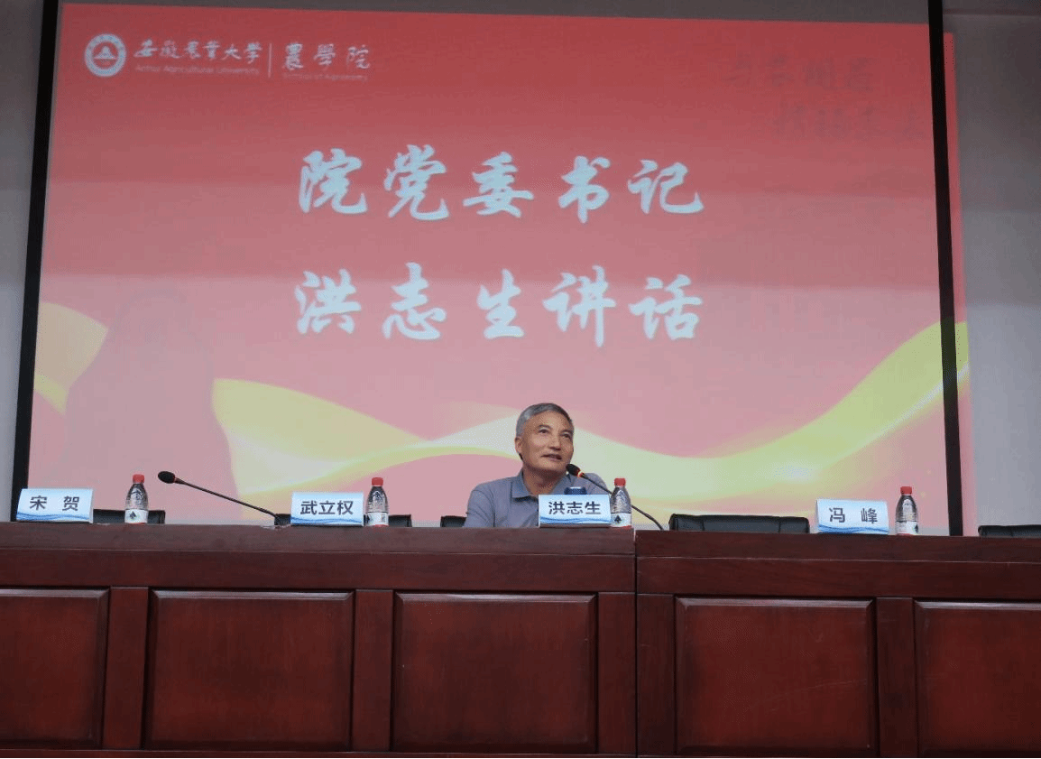 学院党委书记洪志生讲话,希望新生襟怀坦荡、言行一致、无私无畏、养成纯粹清澈的优秀品质,成为拥有忠诚、无我、坚定、远见、务实、先锋精神品质的全面发展的人,引导学生注意网络安全、预防网络诈骗,勤勉学习、积极锻炼,志存高远、脚踏实地,珍惜时光、不负青春,志存高远,脚踏实地,做一个具有全球视野、家国情怀、德才兼备、人格完善的强农先锋、社会英才。