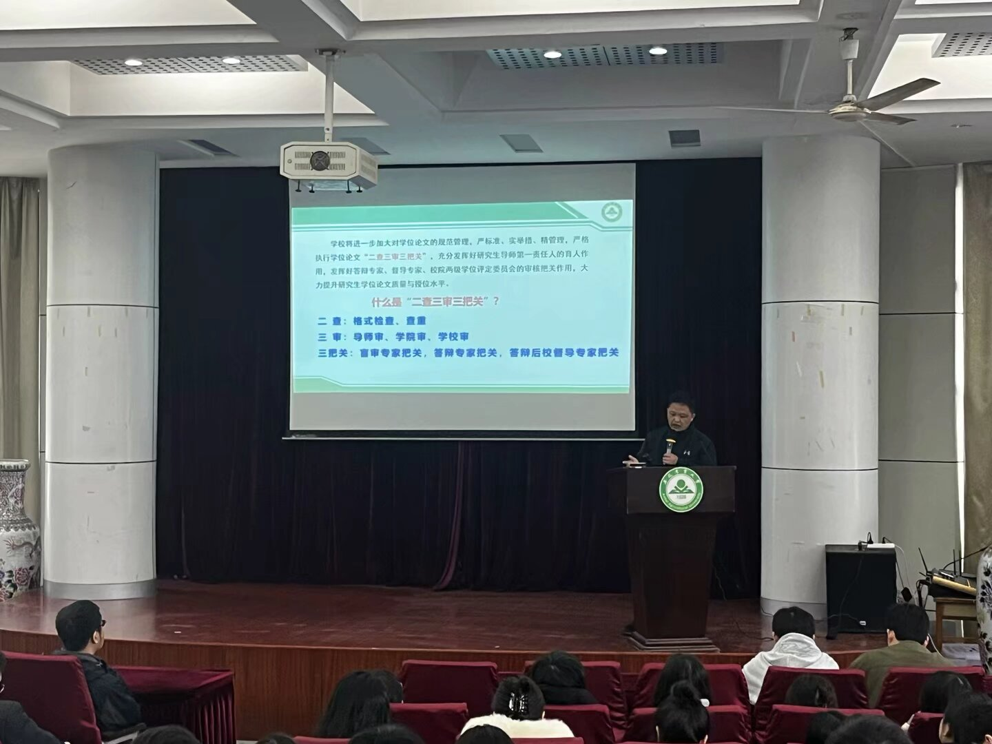本网讯 3月13日下午,林学与园林学院在林学院一楼报告厅举办研究生论文撰写标准及就业形势解读专题讲座,院党委副书记陈枫、副院长张龙娃分别围绕就业形势与求职技巧、毕业论文规范进行分享,2025届全体研究生毕业生参加活动。