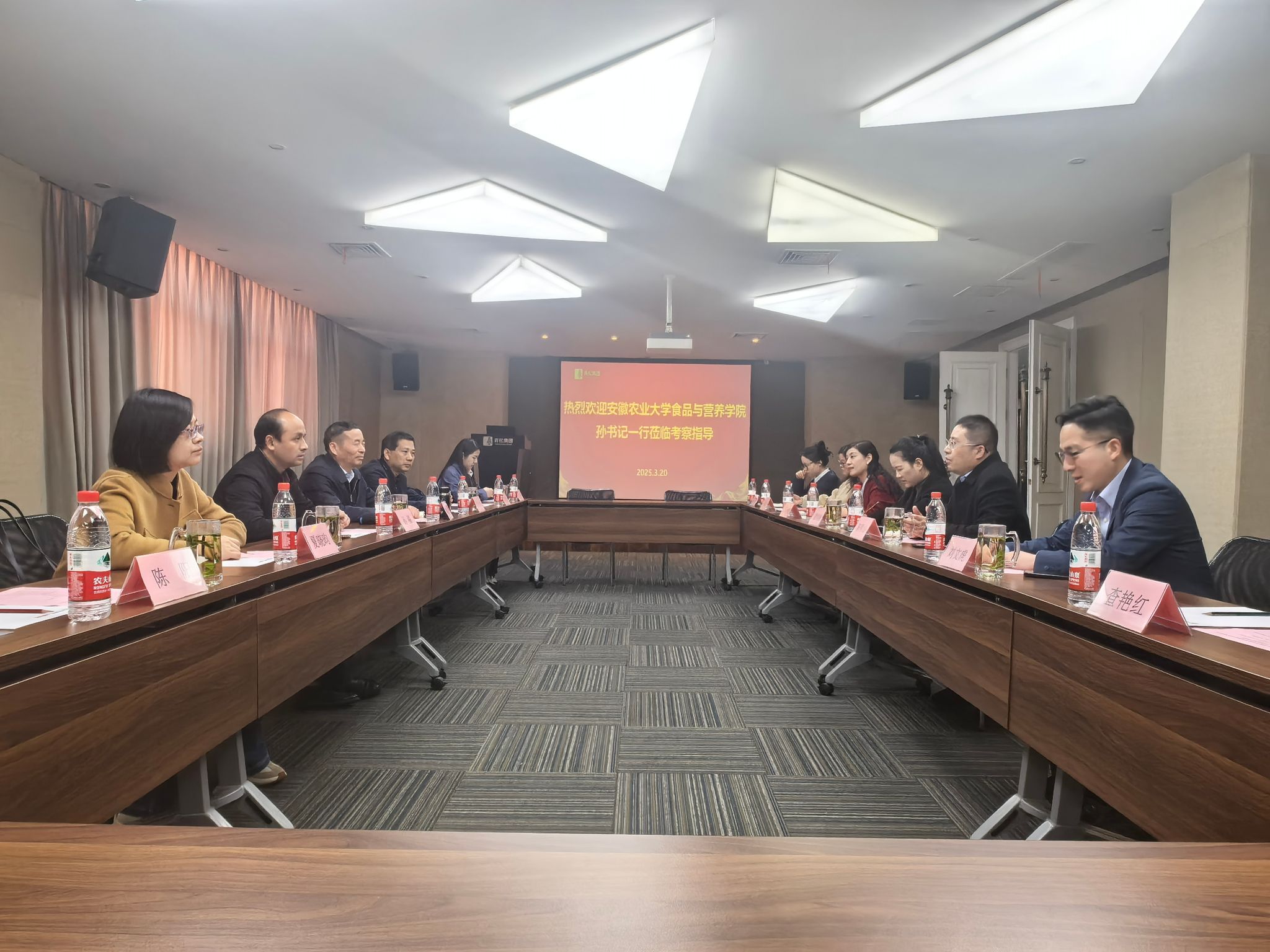 会上,陈明山对学院一行表示热烈欢迎,介绍了集团的基本情况。孙福对青松集团长期以来对学校学院的关心支持表示感谢,就如何加强校企合作、提升学生实践能力提出了建设性意见。周裔彬介绍了学院在食品科学与工程、营养与健康等领域的学科优势及人才培养成果,希望通过此次访企拓岗行动深化与青松集团的合作,为毕业生提供更多优质实习和就业机会。双方围绕大学生就业、实习实训实践、产学研合作等议题展开深入探讨。