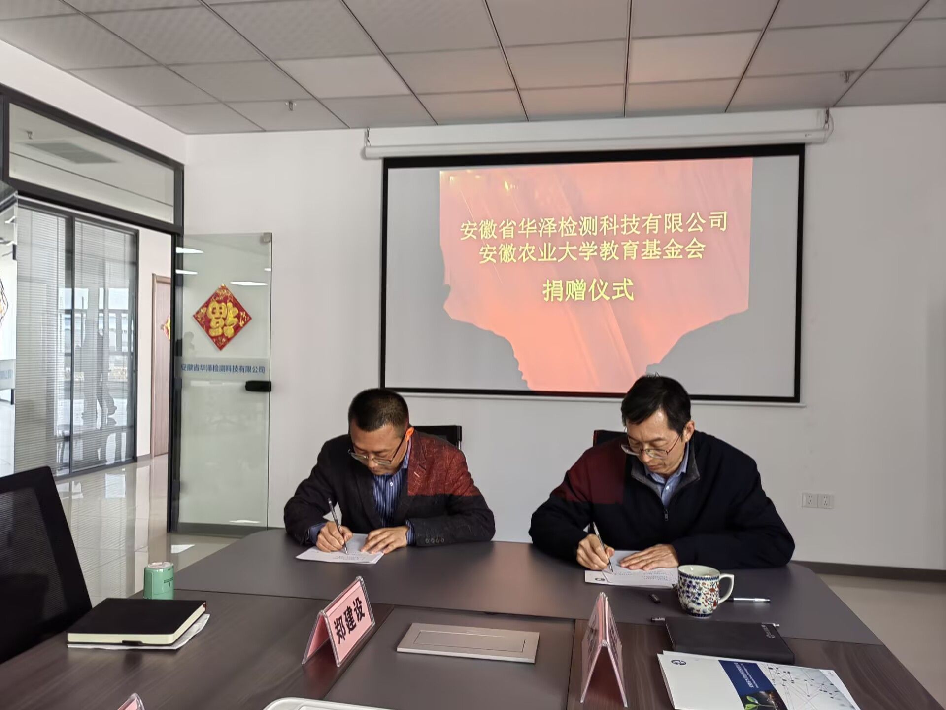 在随后举行的签约仪式上,夏成云与魏志良代表校企双方签署校企合作专项捐赠协议。根据协议,华泽检测将向安徽农业大学教育基金会捐赠15万元,用于支持学生实习实践、创新创业项目孵化及科研平台建设。(文/图/徐菲 编辑/代锐 预审/张飞 审核/周晓娟)