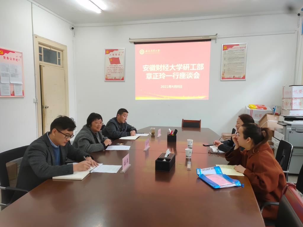 本网讯 4月8日下午,安徽财经大学党委研工部副部长章正玲一行来我校调研。研究生院(研工部)院(部)长蔡永萍主持座谈交流会,研究生院(研工部)副院(部)长姜家生、相关同志参加会议。