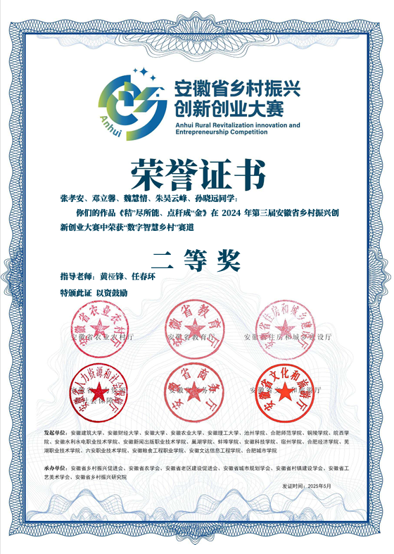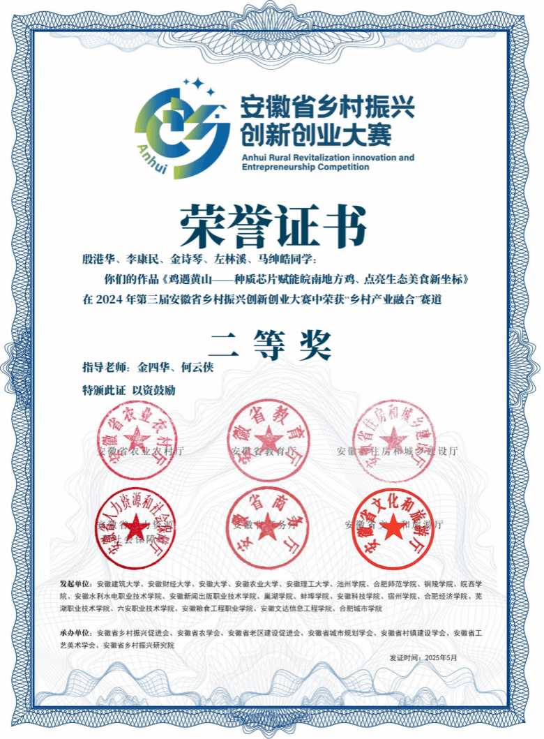 大赛分高校组和社会组,其中高校组共有9520组。大赛自启动以来,指导老师耐心带领团队成员在多年积累的基础上,经团队认真打磨,最终殷港华、李康民、左林溪、马绅皓等同学参与的《鸡遇黄山——种质芯片赋能皖南地方鸡,点亮生态美食新坐标》项目荣获“乡村产业融合”赛道二等奖。张孝安,邓立馨,魏慧情,朱吴云峰,孙晓远参与的《“秸”尽所能,点秆成“金”》项目荣获“数字智慧乡村”赛道二等奖。