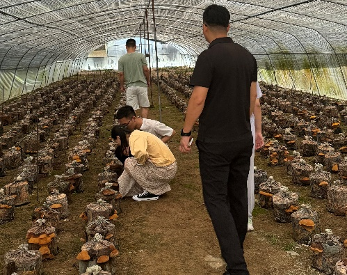 在占地140亩的农光互补中药材基地,实践团观察到“棚顶光伏发电、棚下菌菇种植”的绿色循环模式:光伏板提供清洁能源,恒湿控温大棚则为灵芝、桑黄提供理想生长环境。与此同时,汤家汇镇的香菇产业通过“邮政+合作社+村集体+农户”模式实现全链条赋能:金寨邮政提供物流、金融、品牌建设一站式服务,助力“金寨香菇”获评“中国好香菇”称号,成功破解偏远山区产业发展的物流与销售瓶颈。