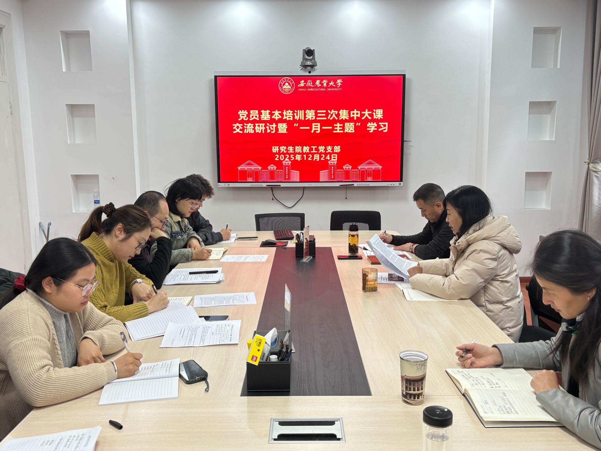 本网讯 12月24日上午,研究生院教工党支部于勤政楼216会议室开展“一月一主题”专题学习暨党员基本培训第三次集中大课交流研讨,会议由支部书记唐红萍主持。