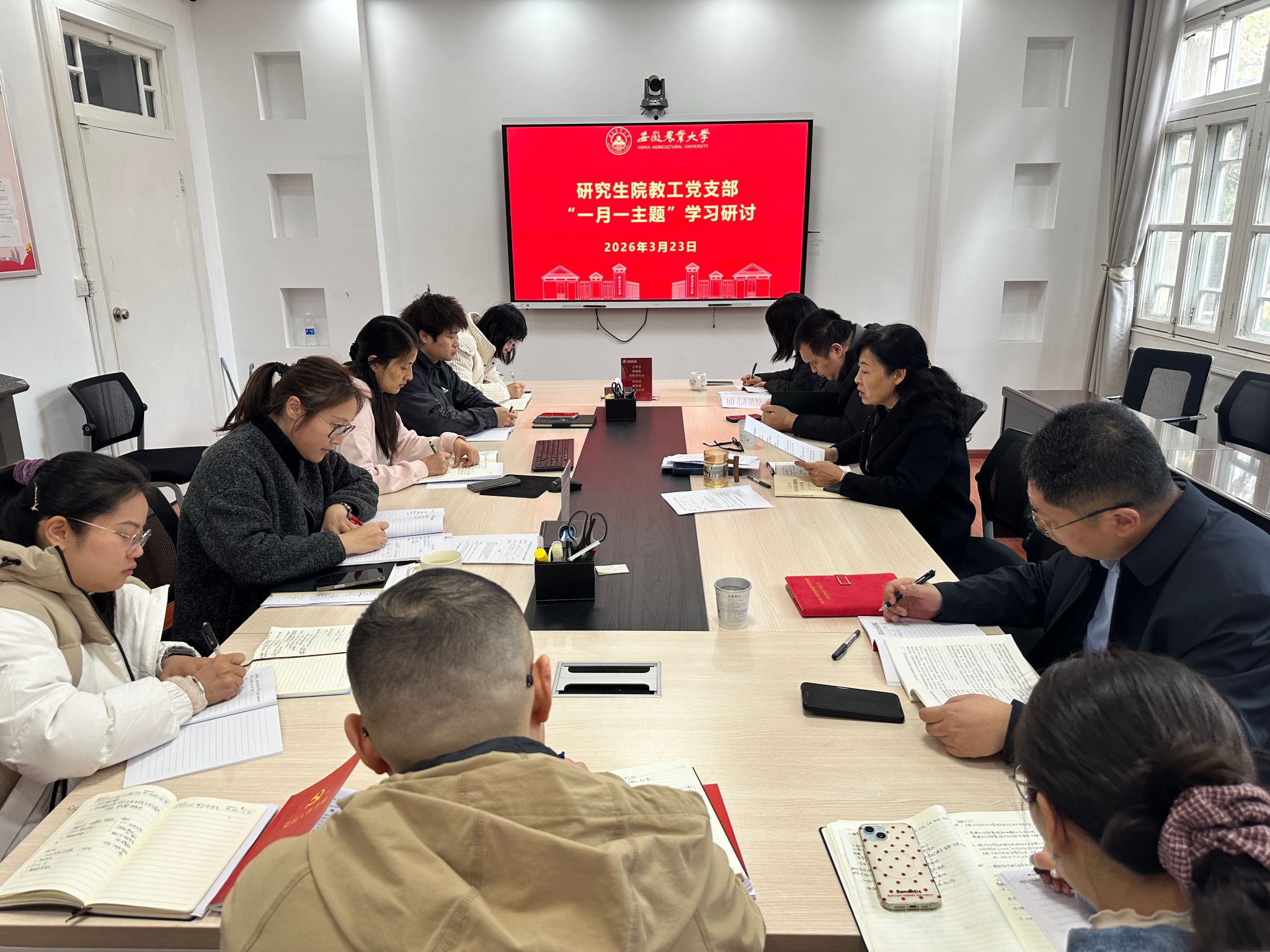 本网讯 3月23日上午,研究生院教工党支部在勤政楼216会议室开展“一月一主题” 学习研讨,支部全体党员参会,会议由支部书记唐红萍主持。