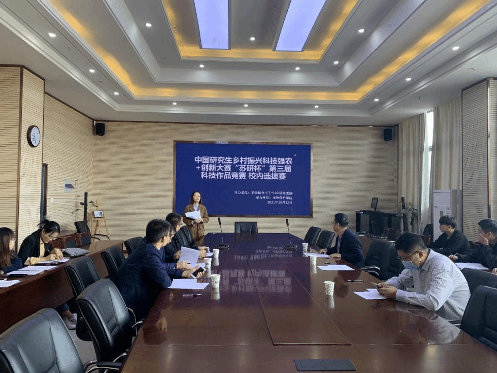 10月12日,在中西部综合楼1213会议室进行了本次选拔赛的现场答辩,植物保护学院副院长张华建主持本次比赛。张华建强调了本次赛事的重要性及意义,表示该赛事旨在助力提升研究生的创新科研和实践能力,作品类型主要有科技发明制作类作品、自然科学类作品、社会科学类作品三类,赛事前期广泛动员,各学院积极踊跃报名。此次答辩希望各位参赛同学都能结合国家助力乡村振兴政策,最大程度的展现良好的专业素质和创新能力。
