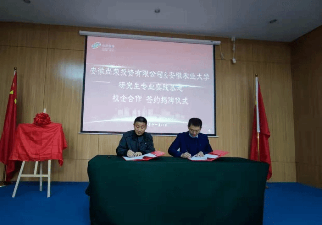 为进一步加强校企合作交流,实现资源共享,优势互补,积极探索校企联合培养创新创业型人才模式,11月8日下午,研究生院(研工部)与安徽尚荣投资有限公司校企合作签约揭牌仪式在安徽尚荣大健康产业园圆满完成。安徽尚荣投资有限公司总经理许凯华、安徽农业大学党委研工部、研究生院副部(院)长姜家生代表双方进行了签约并揭牌。安徽农业大学马克思主义学院党总支副书记、副院长袁修雨,人文社会科学学院党委副书记、副院长吴永红,生命科学学院党委副书记、副院长闫大玮 ,马克思主义学院校外硕士生导师许昆,党委研工部秘书崔文礼及数十名研究生代表参加了会议。
