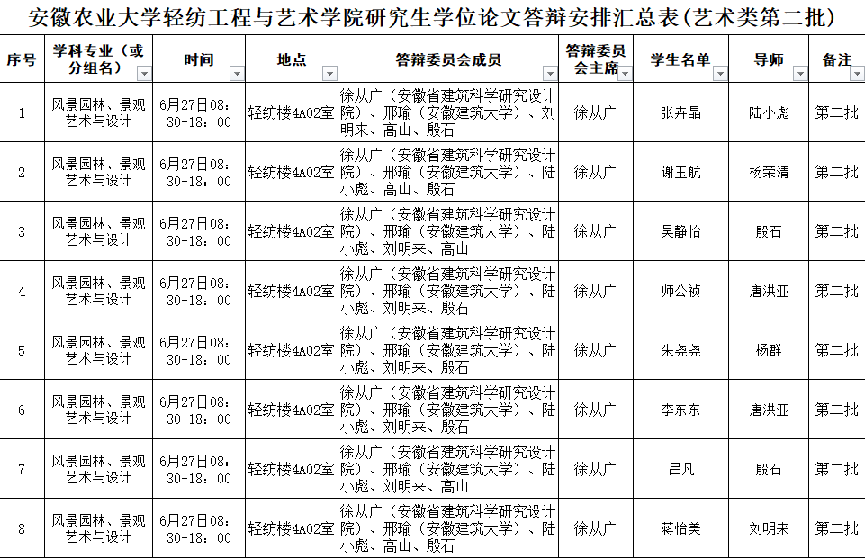 安徽农业大学轻纺工程与艺术学院研究生学位论文答辩安排汇总表(艺术类第二批)
