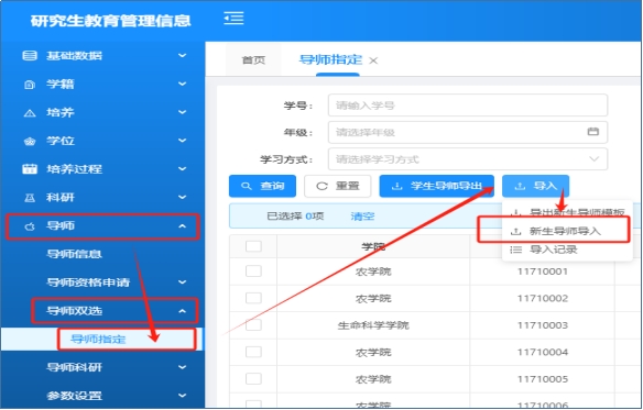 点击“导师”→“导师双选”→“导师指定”→“导入”→下拉菜单选择“新生导师导入”。具体步骤如下图所示: