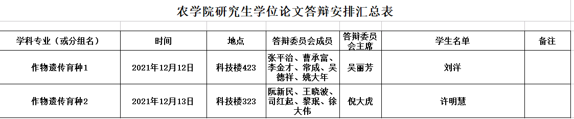 安徽农业大学农学院研究生学位论文答辩安排汇总表(第1批)