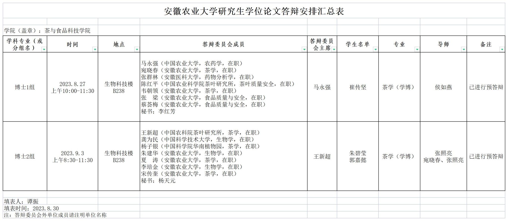 茶与食品科技学院2023年9月博士研究生学位论文答辩安排汇总表