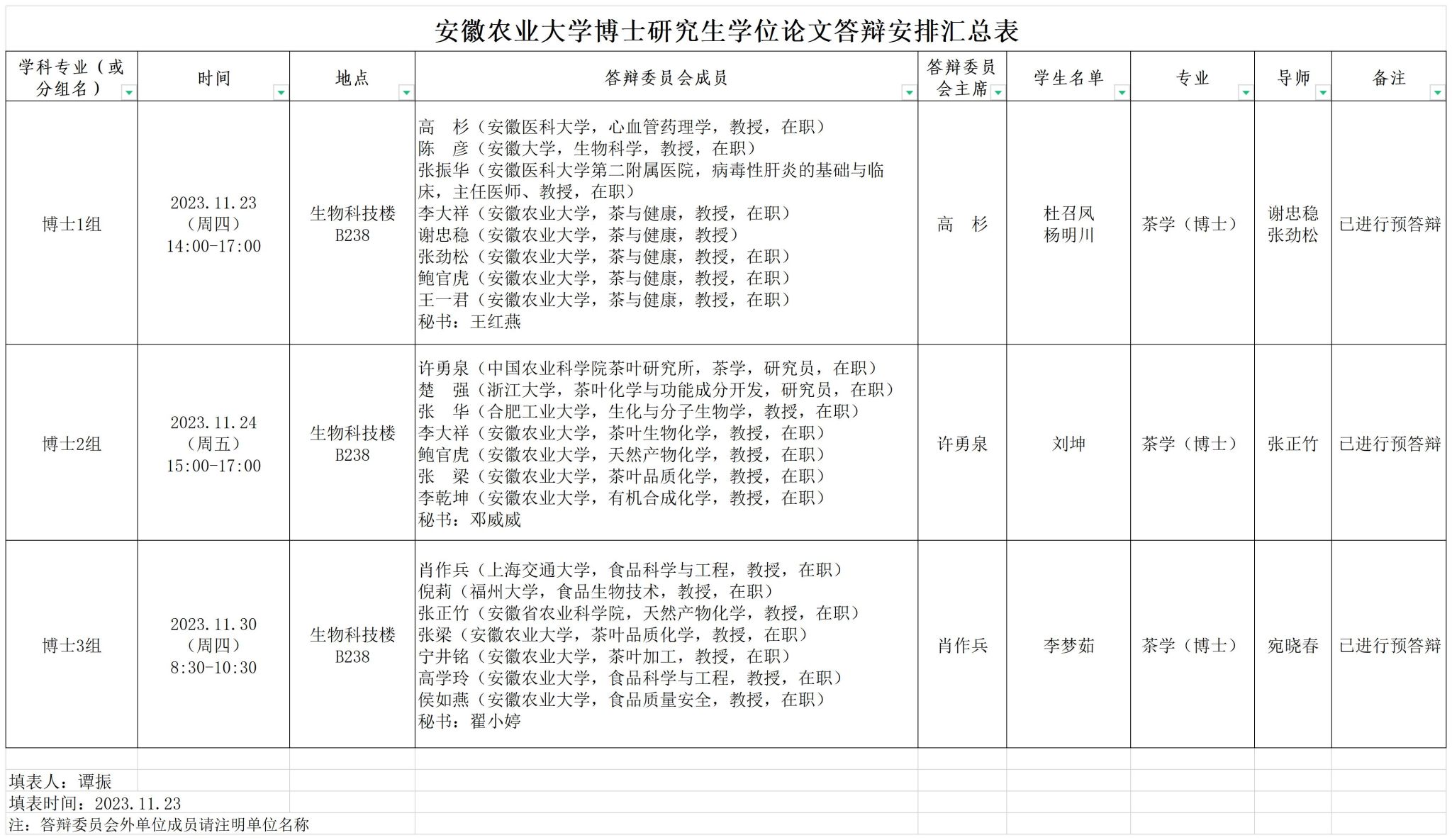 茶与食品科技学院2023年12月博士研究生学位论文答辩安排汇总表
