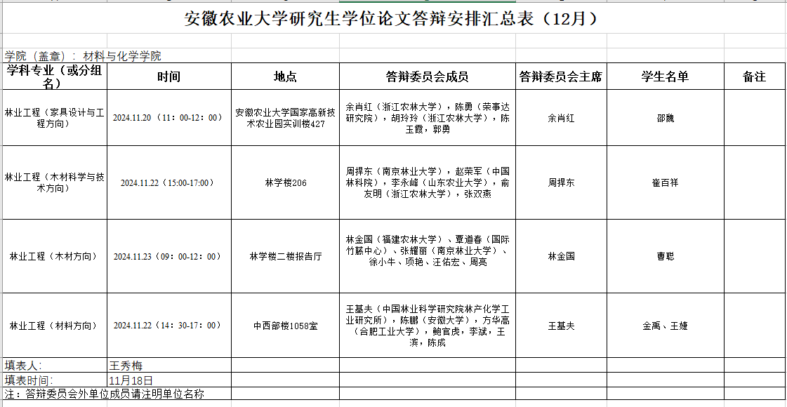 安徽农业大学研究生学位论文答辩安排汇总表(12月)