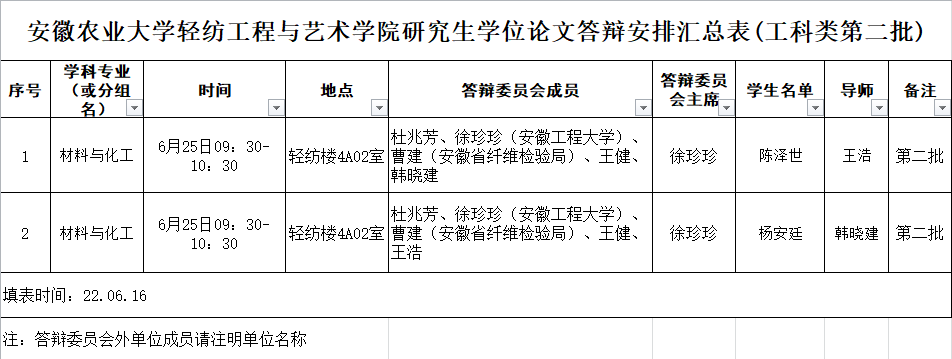 安徽农业大学轻纺工程与艺术学院研究生学位论文答辩安排汇总表(艺术类第二批)