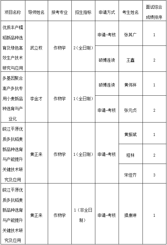 农学院2025年教育部安徽高等研究院校企联合人才培养和科研攻关项目博士生招生“硕博连读”和“申请-考核”考生面试成绩排名公示