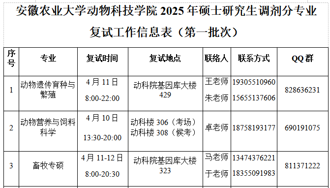 安徽农业大学动物科技学院2025年硕士研究生调剂分专业复试工作信息表(第一批次)