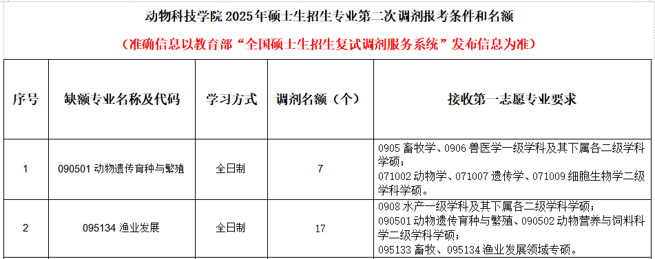 我院动物遗传育种与繁殖学硕、渔业发展专硕调剂系统第二次开放时间为2025年4月11日19时,系统关闭时间根据生源情况确定,欢迎全国各地优秀考生调剂到我院继续深造。