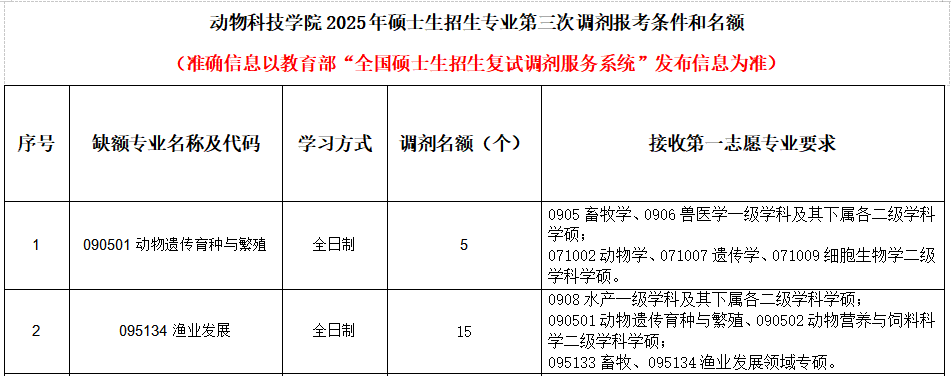 我院动物遗传育种与繁殖学硕、渔业发展专硕调剂系统第三次开放时间为2025年4月15日12时,系统关闭时间根据生源情况确定,欢迎全国各地优秀考生调剂到我院继续深造。