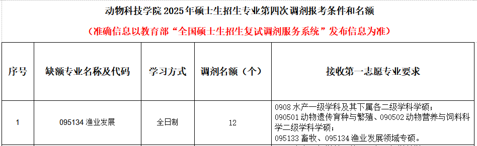 我院渔业发展专硕调剂系统第四次开放时间为2025年4月16日22:00,系统关闭时间根据生源情况确定,欢迎全国各地优秀考生调剂到我院继续深造。