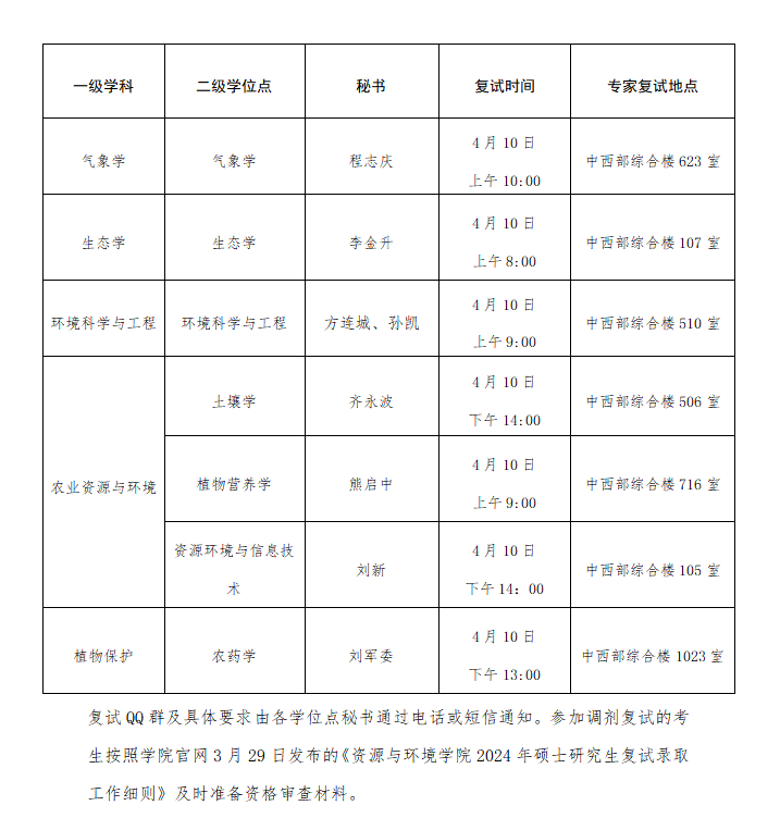 资源与环境学院2024年各学位点(全日制调剂志愿)硕士研究生复试安排