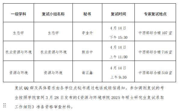 资源与环境学院2025年硕士研究生招考(增补调剂)复试安排及考生复试名单