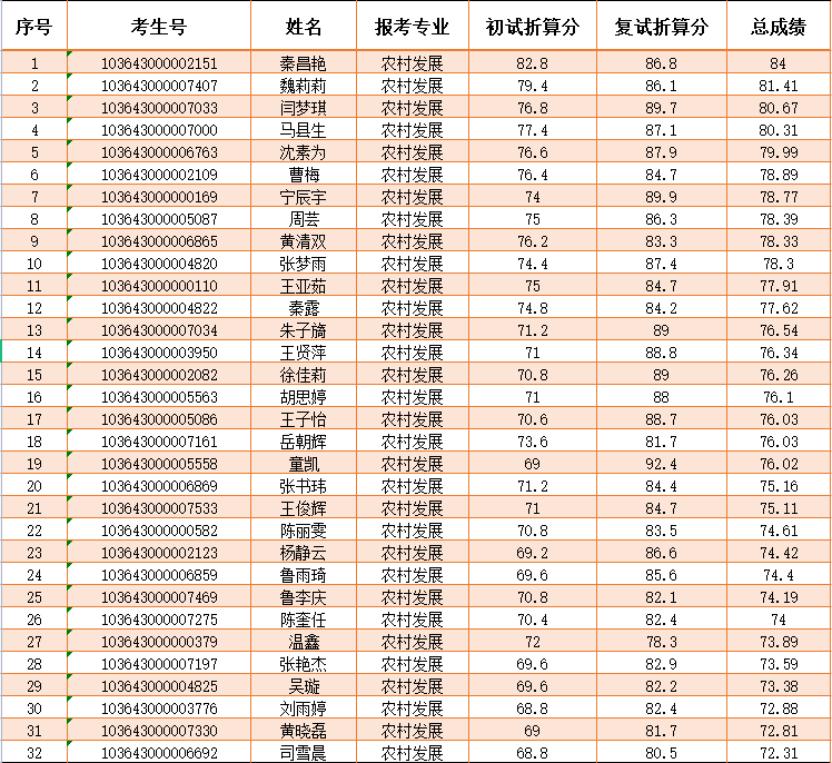 现将马克思主义学院2023年4月4日硕士研究生农村发展全日制专业(第一志愿)综合成绩予以公示,公示截止时间4月5日20:00,逾期不予受理。