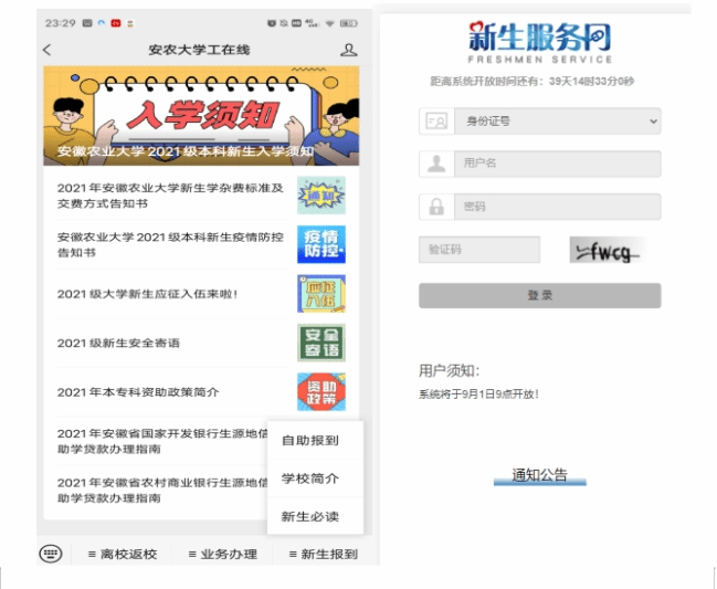 通过“新生报到”——“学校简介”可以了解学校概况、校园风光和资讯。点击“自助报到”,登录“安徽农业大学新生自助报到系统”(系统将于9月1日上午9:00开通),填写完善个人及家庭信息、选择宿舍、完成床上用品是否订购、绿色通道、上传附件(疫情防控学生承诺书签字拍照上传、健康码和通信大数据行程卡截图上传)等信息采集,以备学校在您入校前进行统计,方便迎新服务安排。操作流程如下: