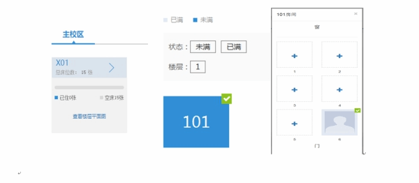 4、点击“网选宿舍”(实际界面与图例可能有少量不同)。点击“X01”区域向右箭头,再点击“101”区域,选择床号。实际界面有可供选择的宿舍号,选好宿舍号后,再选床号。注意:选好后不可更改。合肥市区自有住房或已婚租住合肥的学生如办理走读,在“是否需要住校”点“否”,无需选择宿舍,进入下一步。办理走读需提供房产或已婚且租住合肥的证明,届时详见《2021级研究生入学须知》(备注:X01代表校内宿舍楼1栋;若是G01代表大学生公寓小区校外宿舍楼栋;101是房间号)