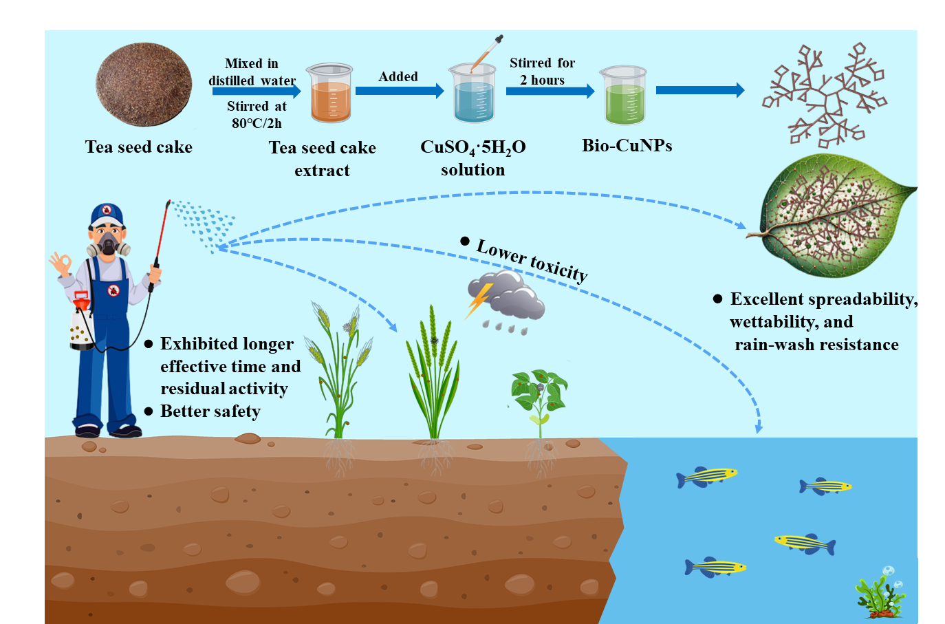 铜制杀菌剂是一种常用的保护性杀菌剂,但其不耐雨水冲刷,导致铜的瞬时大量释放,进而引发严重的环境污染与生态风险。本研究以五水硫酸铜和茶籽饼的水提取液为反应原料,利用生物合成技术成功制备纳米氧化铜(Bio-CuNPs)。这种Bio-CuNPs具有独特的树枝状三维拓扑结构,与商品化铜制剂可杀得(Kocide)相比,在番茄、水稻和小麦叶