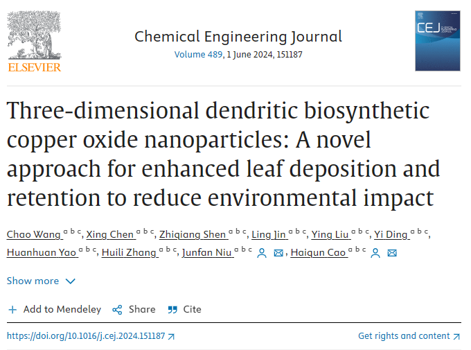 近日,我校植物保护学院操海群教授团队在《Chemical Engineering Journal》(中科院一区TOP,IF=15.1)发表生物合成纳米铜相关研究论文,题目为“Three-dimensional dendritic biosynthetic copper oxide nanoparticles: a novel approach for enhanced leaf deposition and retention to reduce environmental impact”。